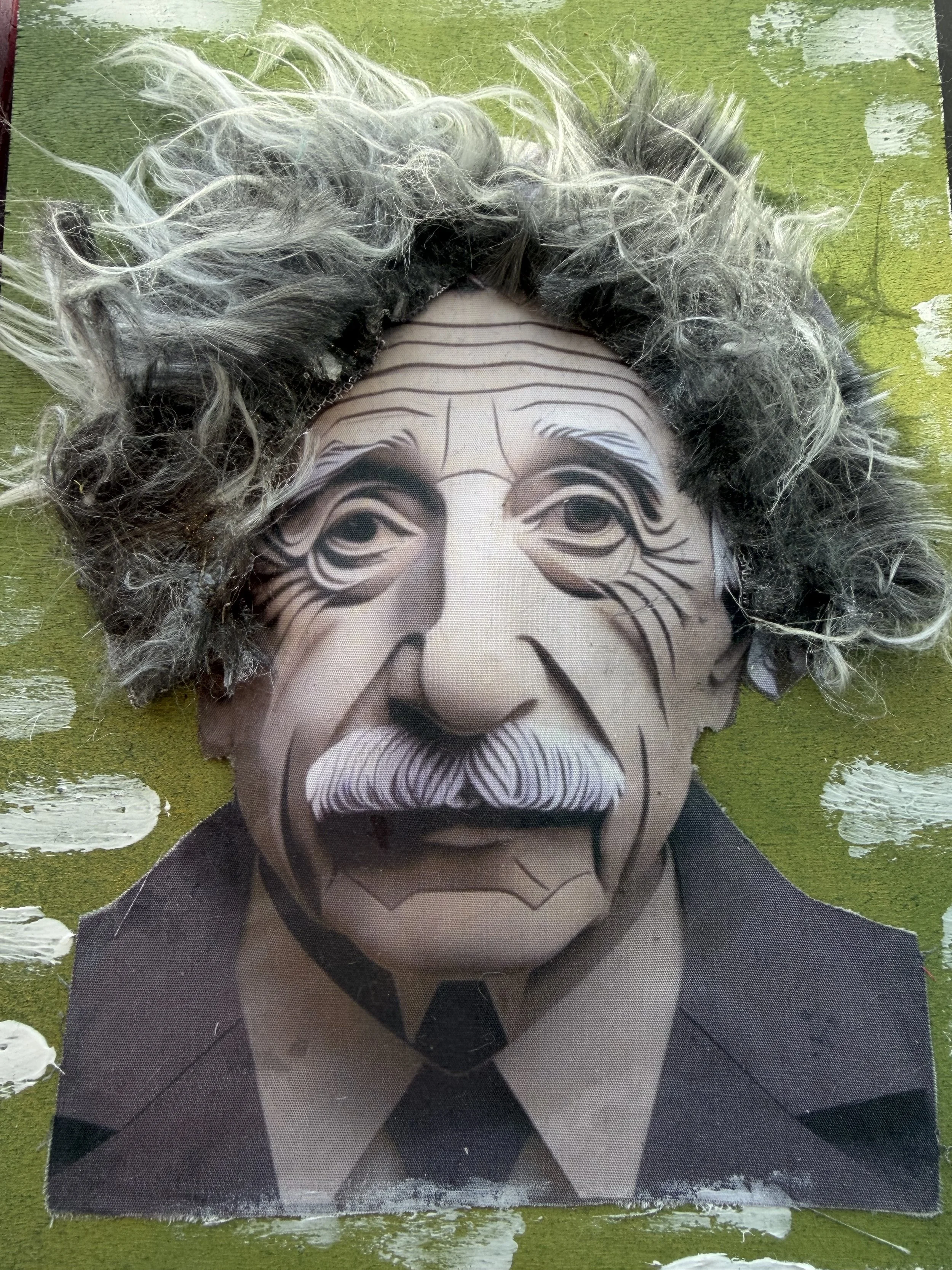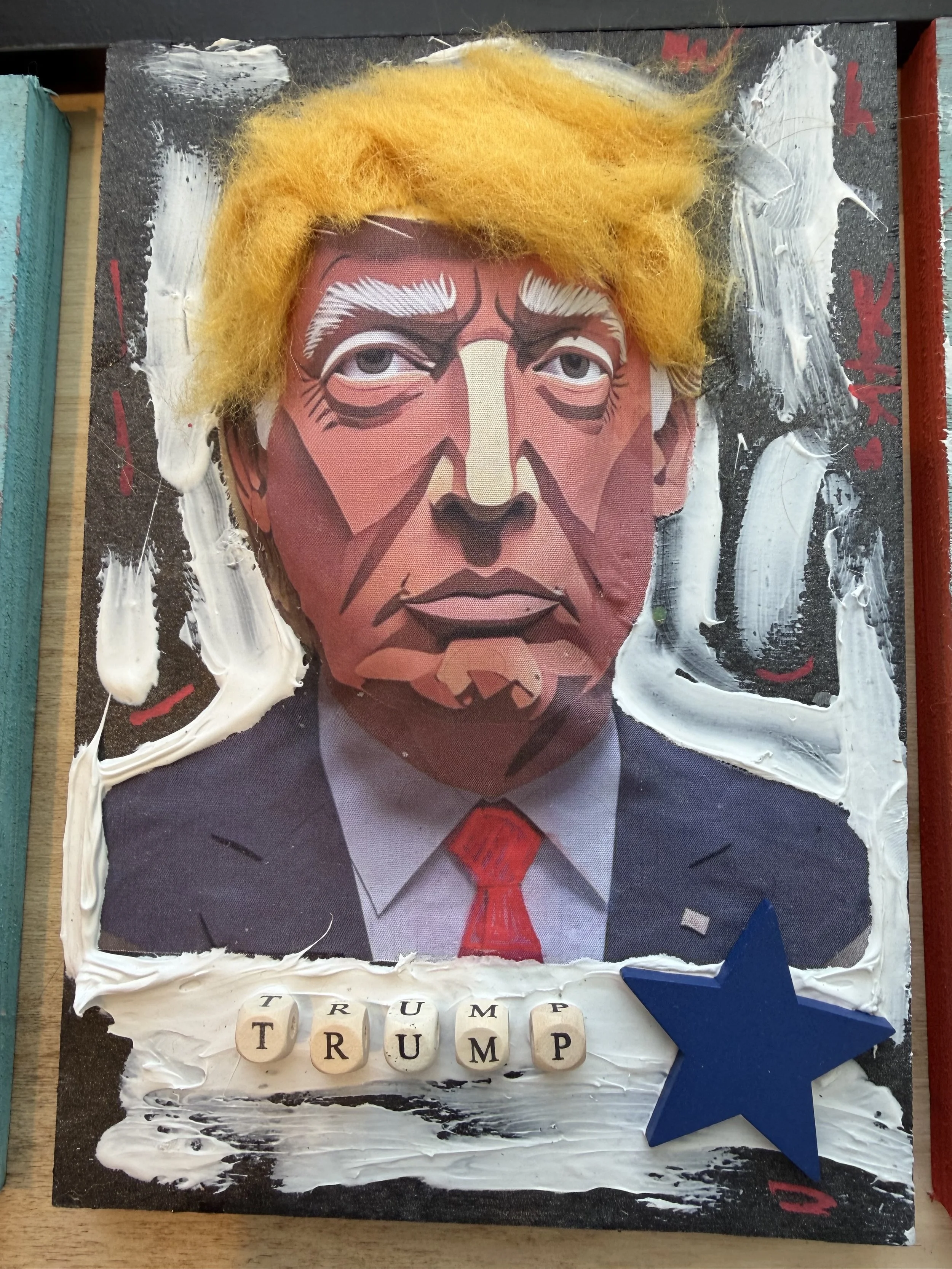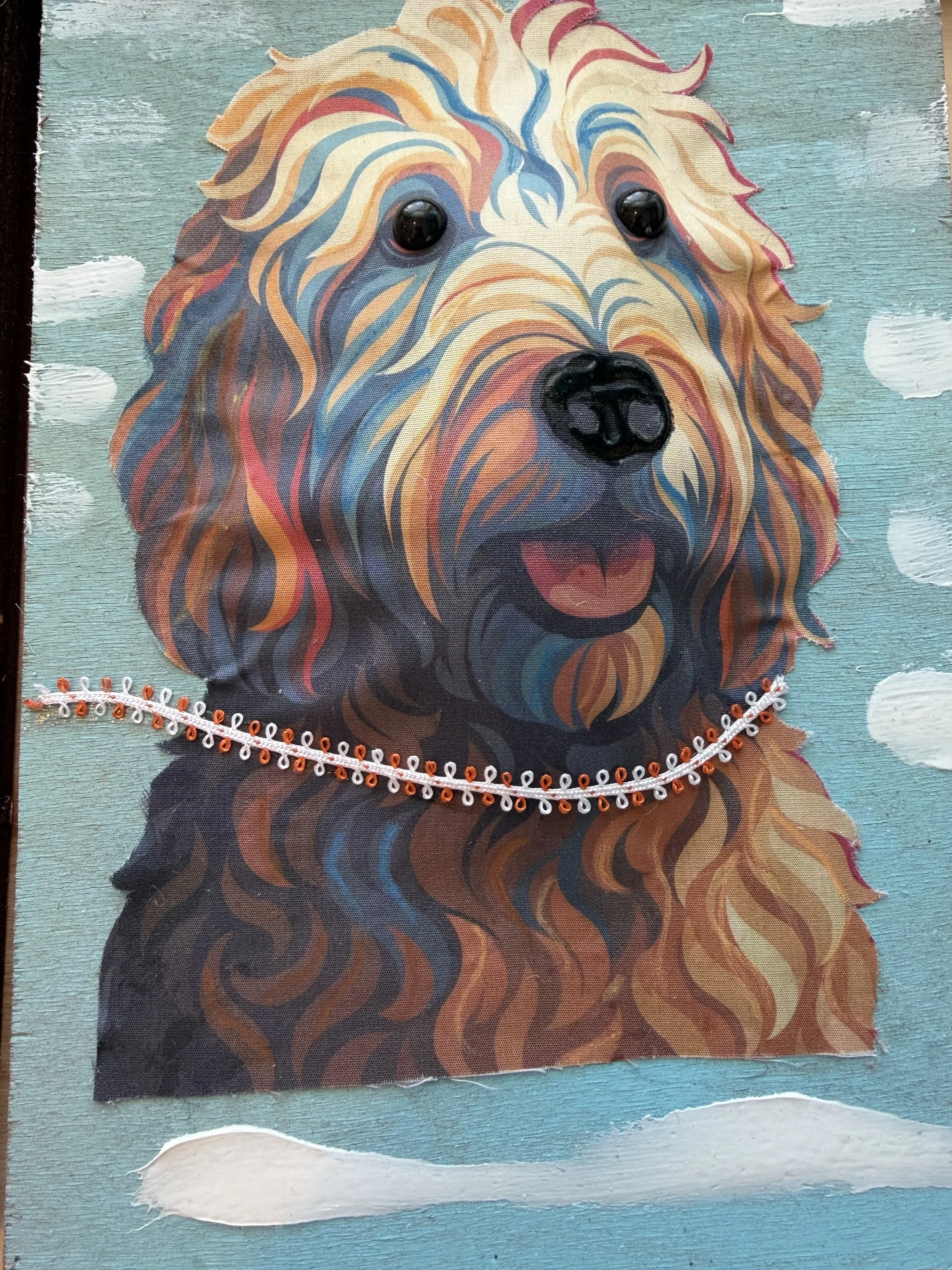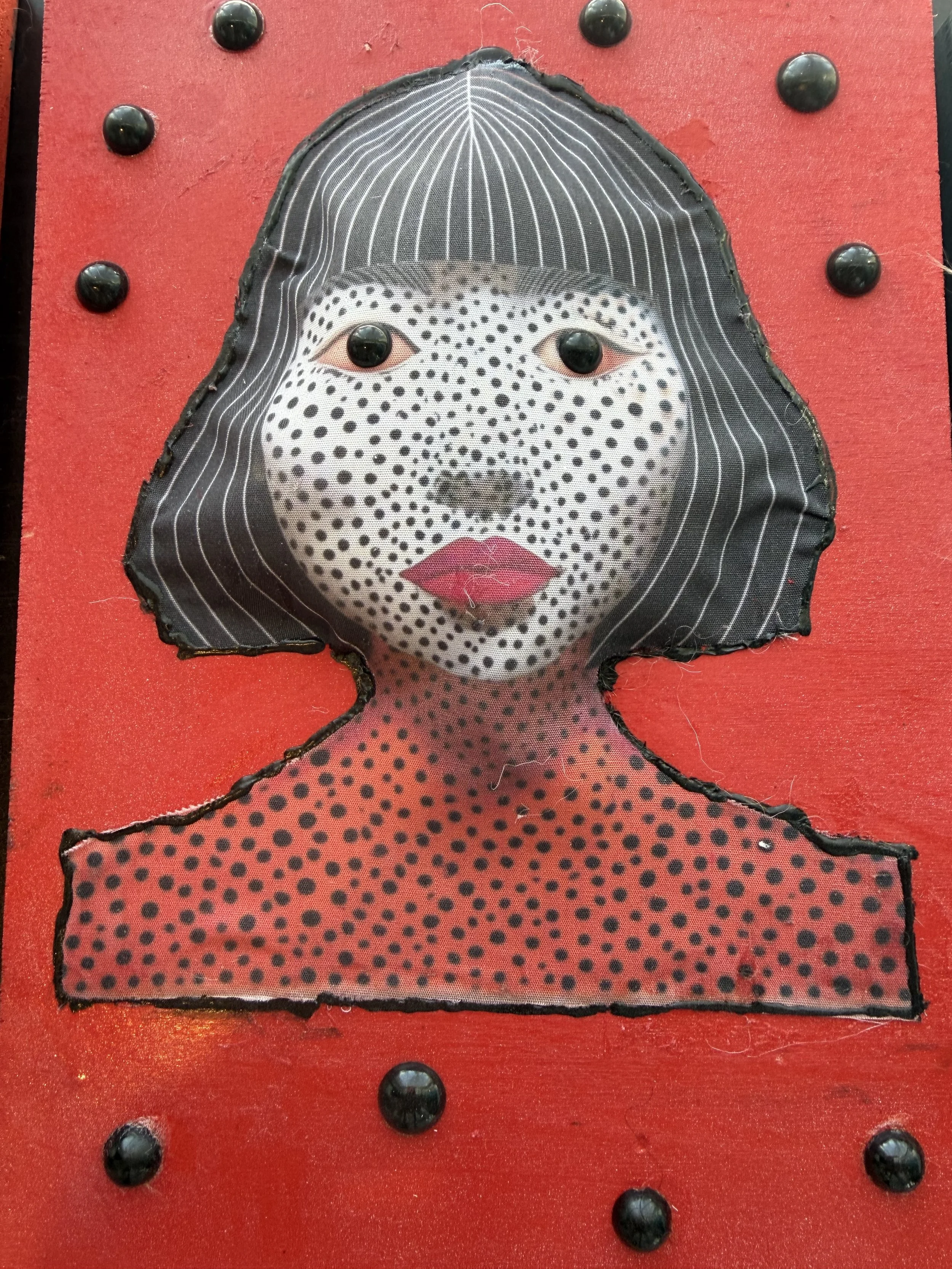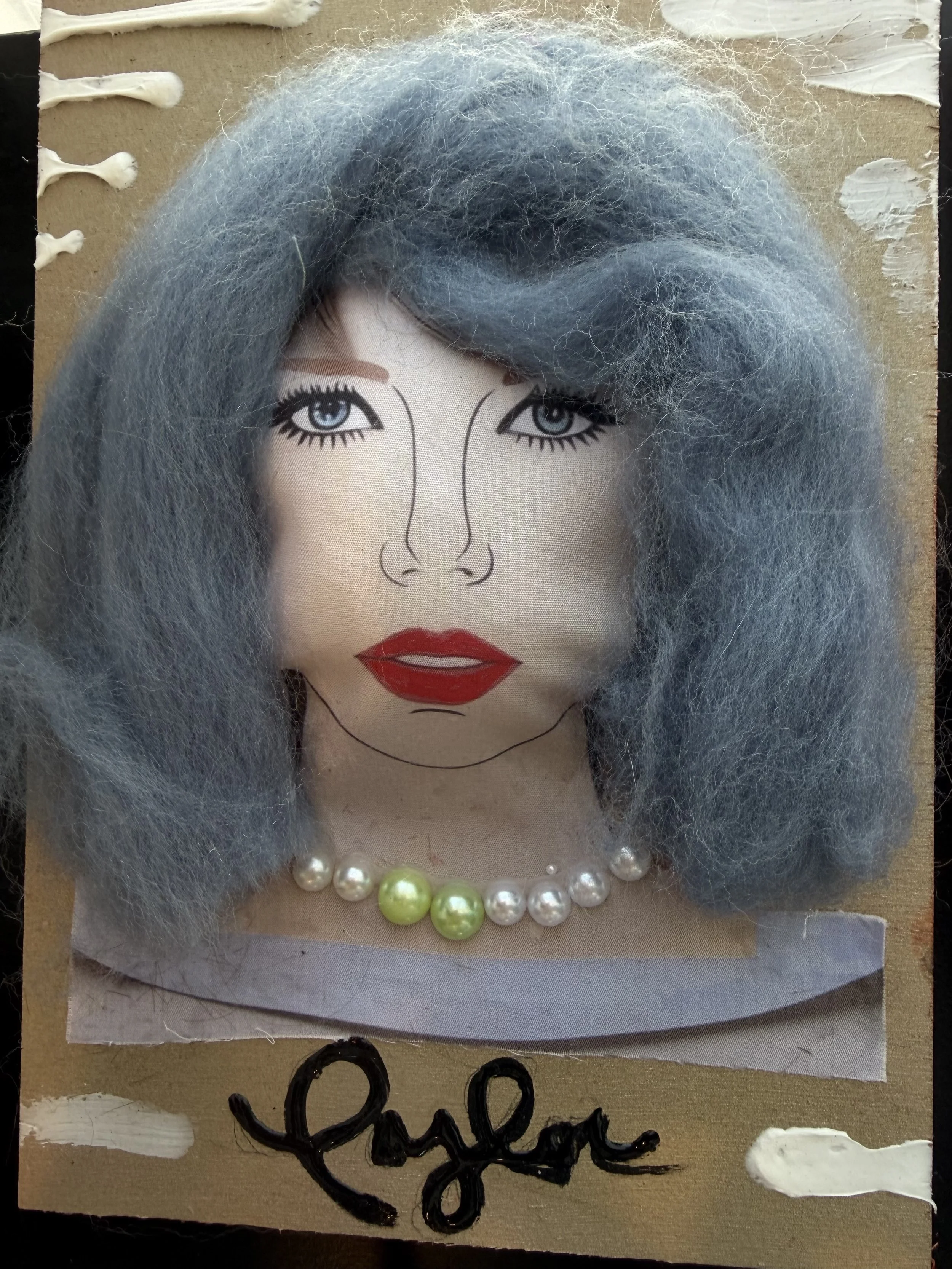 Each artwork is digitally composed, printed, and hand-enhanced with layered materials including paint, fiber, sculptural elements, and embellishments.
